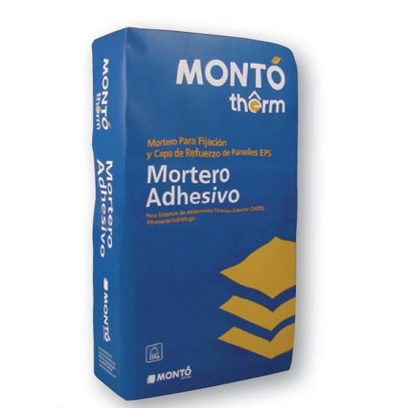 Argamassa cimentosa cinzenta em pó,pertencente ao Sistema de Isolamento Térmico Exterior MONTÓ therm®, ideal para a fixação de painéis isoladores (EPS, lã mineral, lã de vidro, etc.) e posterior execução da camada de isolamento e reforço